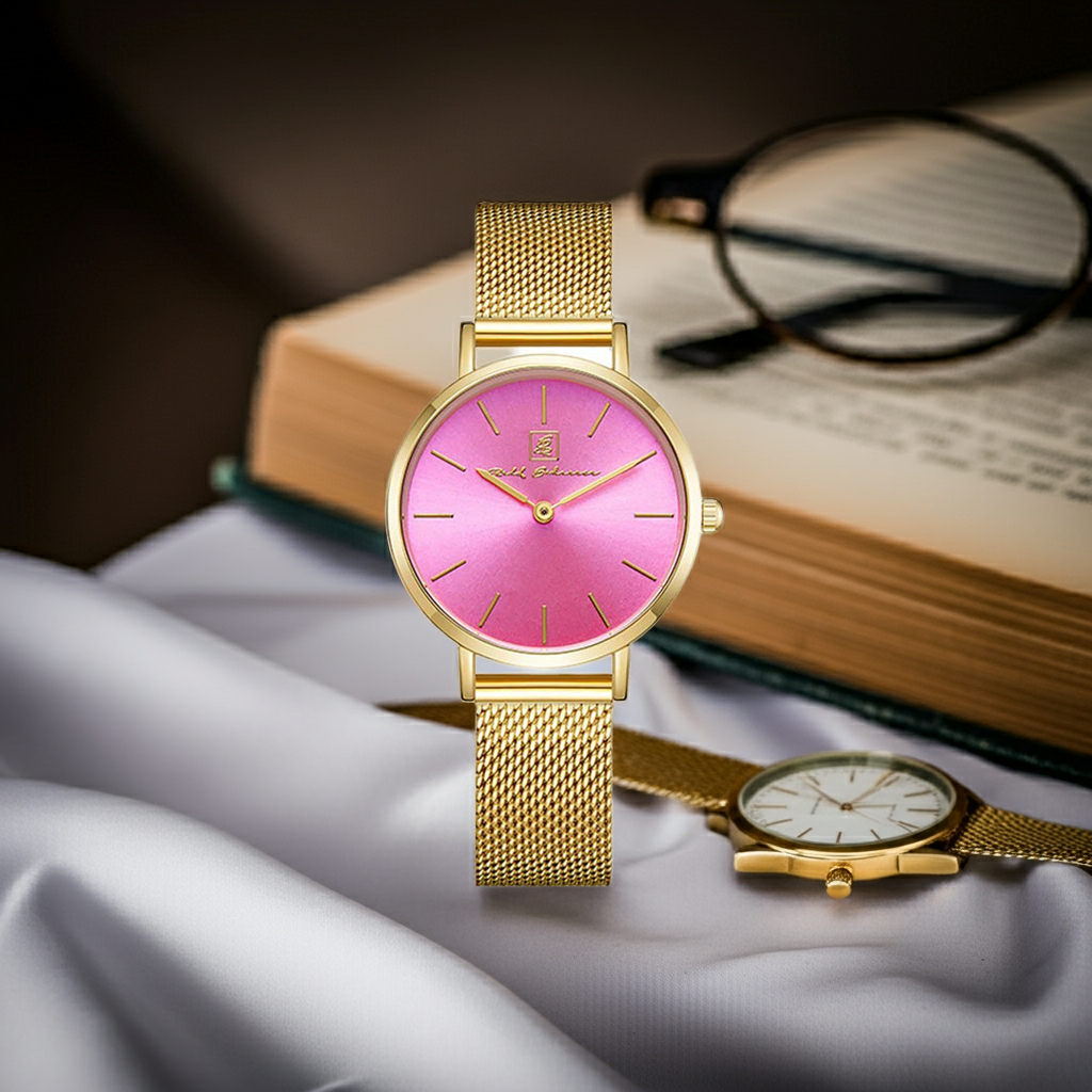 Die Damenuhr in Gold mit Milanese Armband und pinkem Ziffernblatt “Leipzig” vereint zeitlose Eleganz mit einem Hauch von Modernität. Ihr goldenes Milanese Armband strahlt Luxus und Raffinesse aus, während das pinke Ziffernblatt einen frischen, modischen Akzent setzt. Die goldenen Zeiger und stilvollen Markierungen fügen sich harmonisch ins Design ein und machen diese Uhr zu einem perfekten Begleiter für jeden Anlass. Das feine Milanese Armband passt sich angenehm Ihrem Handgelenk an und sorgt für maximalen Tragekomfort. Kombiniert mit dem auffälligen pinken Ziffernblatt wird die Uhr zum stilvollen Blickfang, der Ihre Persönlichkeit unterstreicht. Die Damenuhr in Gold mit Milanese Armband und pinkem Ziffernblatt “Leipzig” ist ein Statement für Frauen, die klassische Eleganz mit einem Hauch von Farbe lieben.