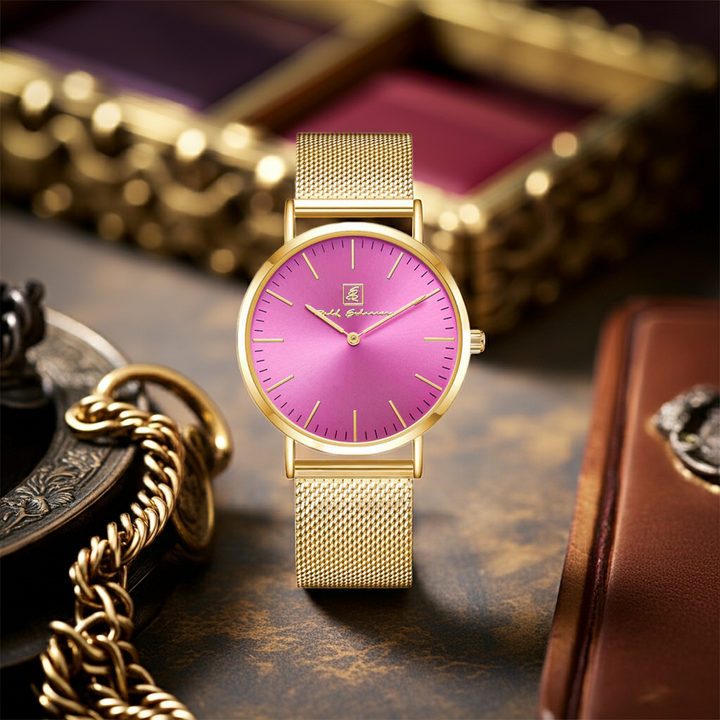 Diese exklusive Damenuhr Pink/ Gold “Wiesbaden” überzeugt durch ihr hochwertiges Miyota Laufwerk, das für Präzision und Langlebigkeit bekannt ist. Mit einer Gehäusebreite von 40 mm und einer flachen Bauweise von nur 6 mm liegt die Damenuhr Pink/ Gold “Wiesbaden” angenehm am Handgelenk und passt sowohl zu klassischen als auch zu modernen Outfits. Das elegante Gold Gehäuse harmoniert perfekt mit den pinkfarbenen Details und sorgt für einen femininen Look. Dank der 3 ATM Wasserbeständigkeit ist die Damenuhr Pink/ Gold “Wiesbaden” zudem für den Alltag bestens geeignet.