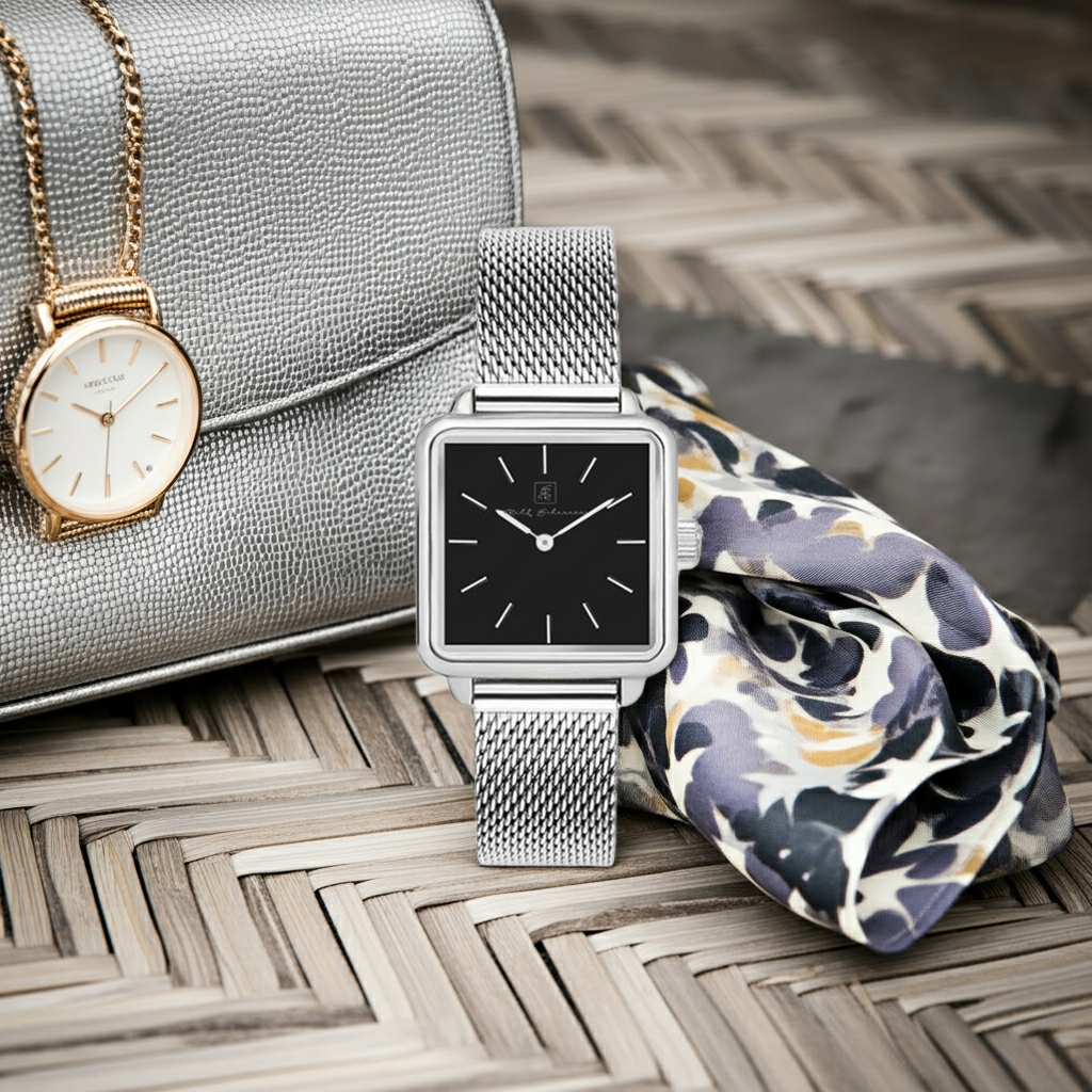 Die Damenuhr in Silber viereckig Mesh mit schwarzem Ziffernblatt ist ein elegantes Accessoire, das durch seine klare Linienführung und moderne Optik besticht. Das viereckige Gehäuse in Silber verleiht der Uhr ein markantes, zeitgemäßes Design, das sowohl schlicht als auch raffiniert wirkt. In Kombination mit dem tiefschwarzen Ziffernblatt entsteht ein harmonischer Kontrast, der für ein edles und minimalistisches Gesamtbild sorgt. Das fein gearbeitete Mesh-Armband in Silber ergänzt das Design perfekt und sorgt für einen dezenten Glanz, der die Uhr zum Blickfang macht.
