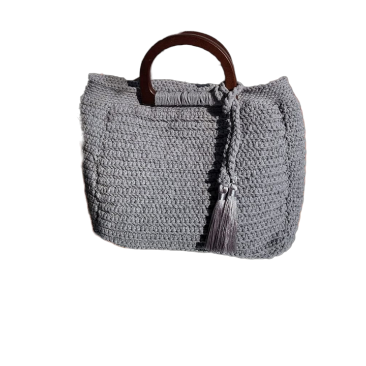 Strick- Tragetasche in Grau mit Holzgriff