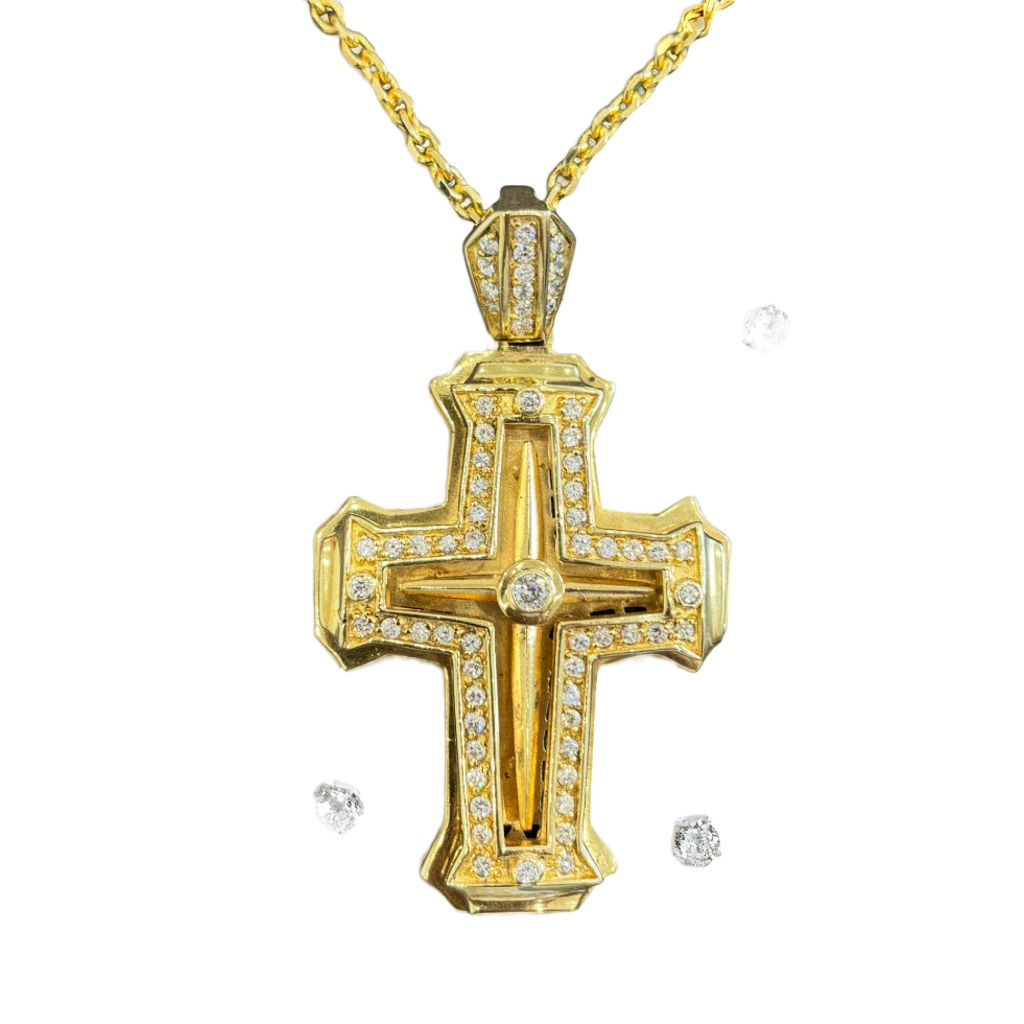 Dieses Schmuckstück ist ein absolutes Einzelstück und verkörpert zeitlose Eleganz in eindrucksvoller Größe. Der plastische Kreuz-Anhänger ist aus hochwertigem Silber gefertigt und aufwendig gelbvergoldet, wodurch er einen warmen, luxuriösen Glanz erhält. Die edle Form wird durch präzise gefasste, weiße Zirkoniasteine veredelt, die dem Kreuz eine strahlende Brillanz verleihen.