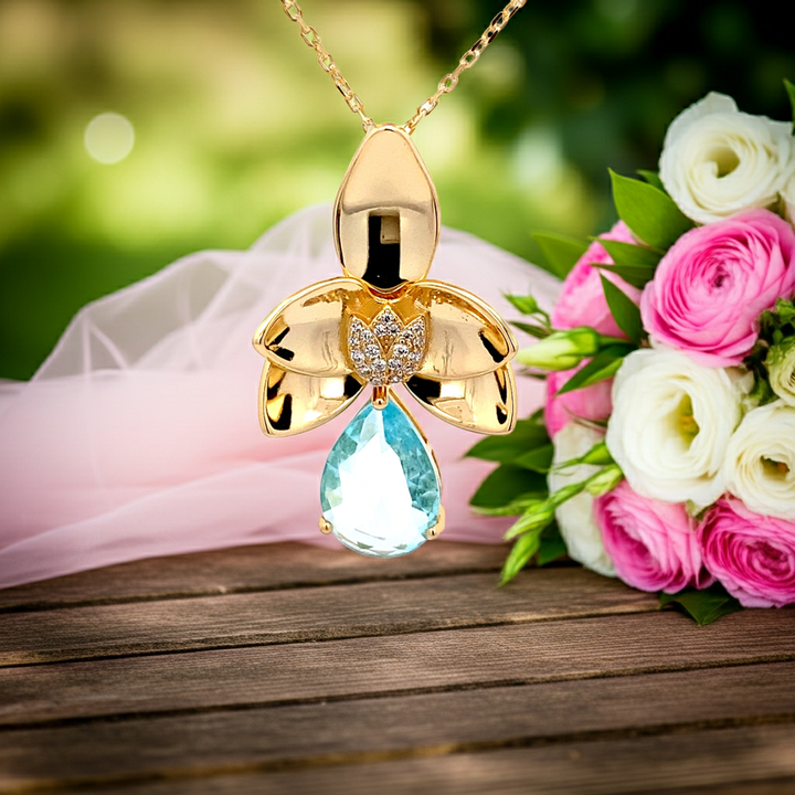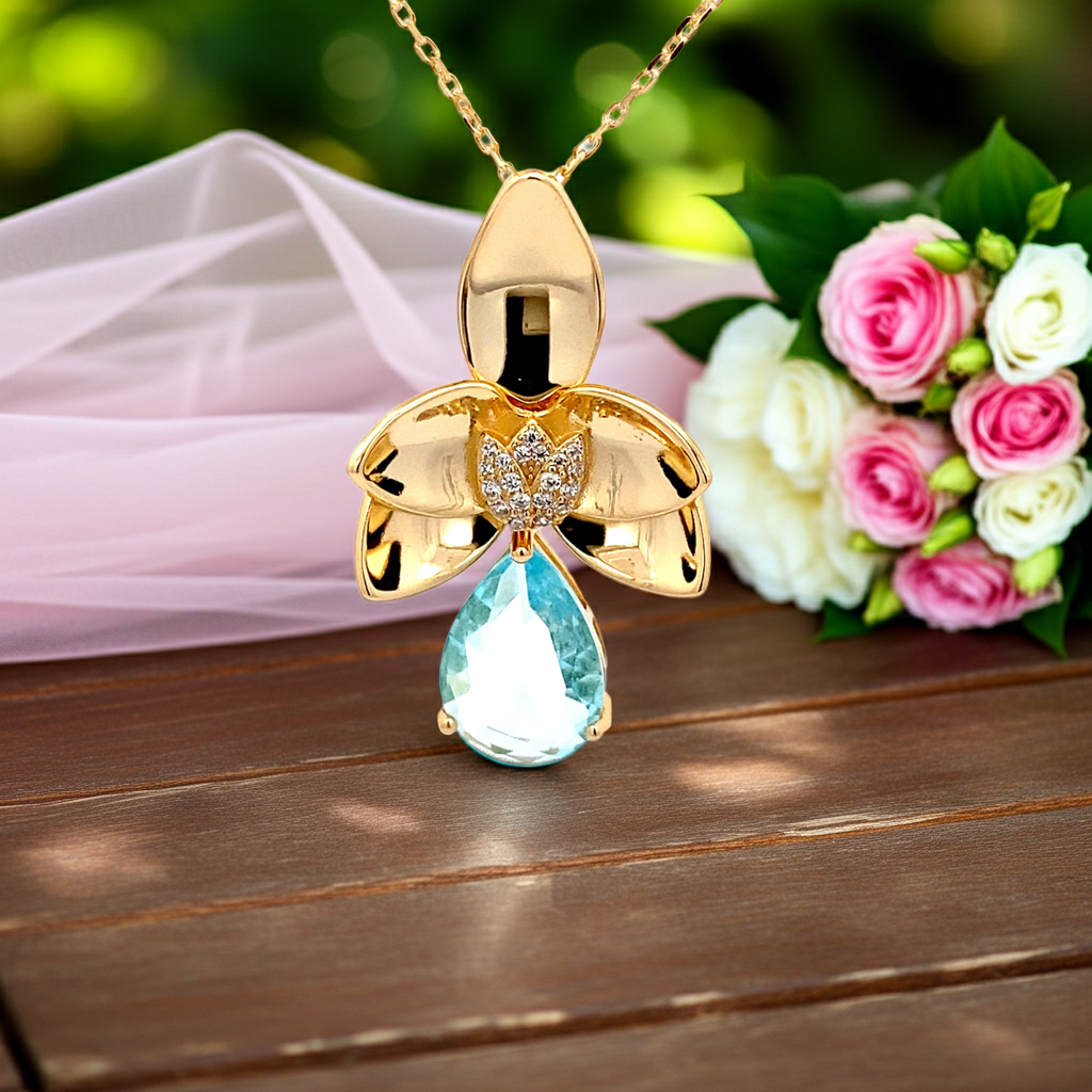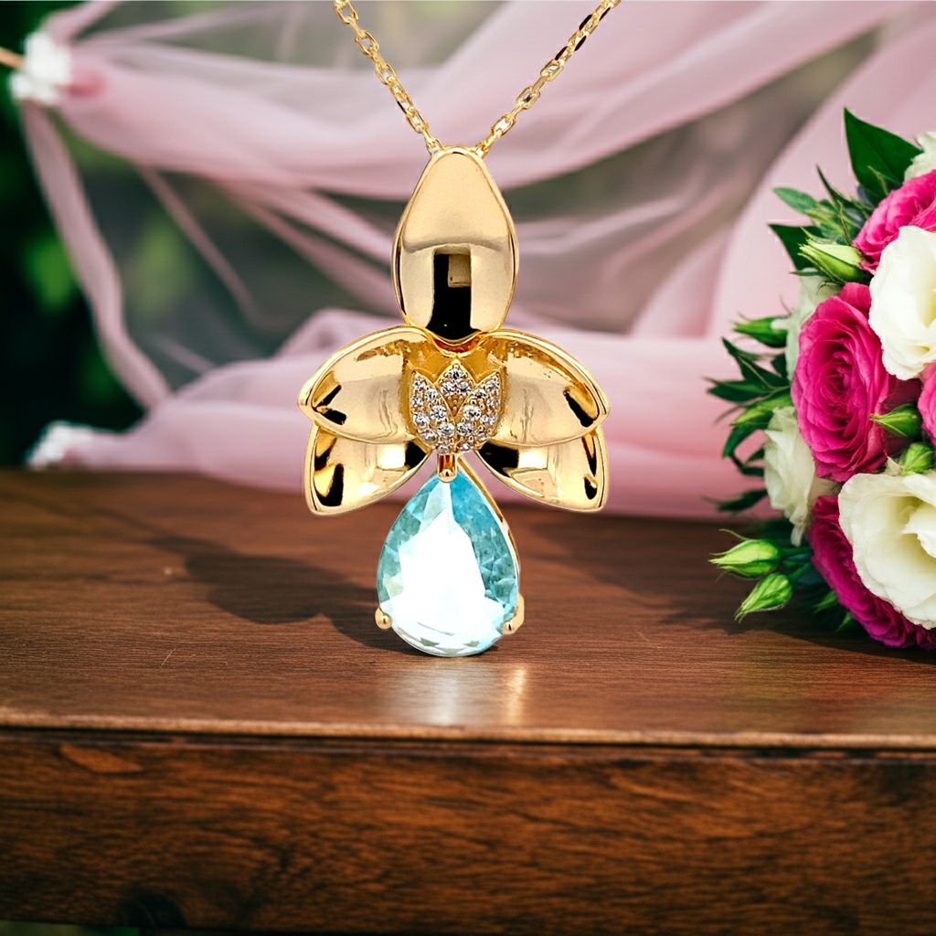 Dieser Schmuckanhänger symbolisiert Feminität, Frische und Eleganz. Der hellblaue Zirkonia-Tropfen erinnert an glitzerndes Wasser und sorgt für eine edle Farbwirkung, während die Kombination mit der fein gearbeiteten Blüte Leichtigkeit und Natürlichkeit ausstrahlt. Perfekt geeignet sowohl für den Alltag als auch für festliche Anlässe. Mit diesem gelbvergoldeten Silber- Blumen-Anhänger mit Kette trägst du ein Schmuckstück, das klassisch und modern zugleich wirkt. Der farbintensive Zirkonia in Tropfenform macht jedes Outfit zum Blickfang und verleiht einen Hauch von Luxus.