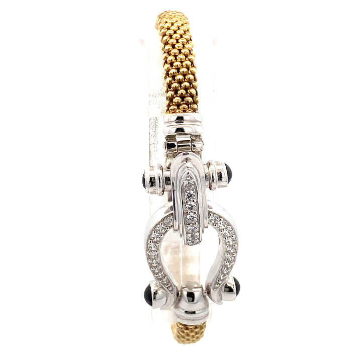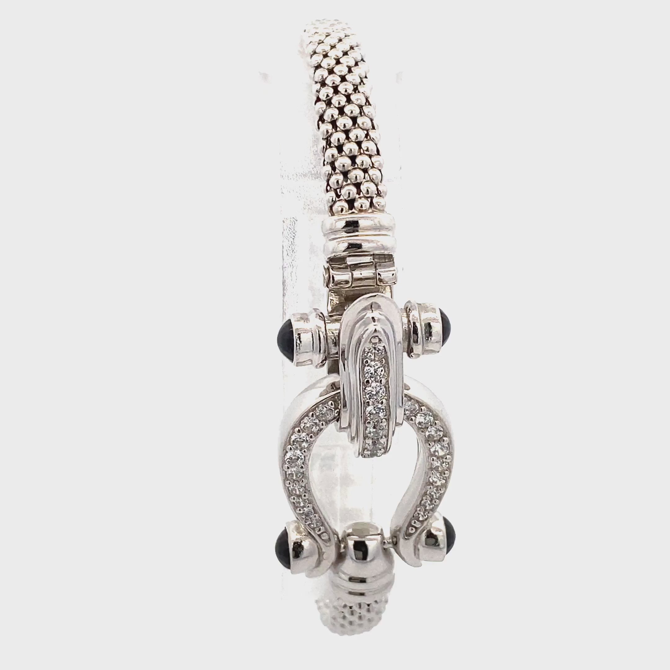 Dieser exklusive Damenarmreif im Steigbügel-Design vereint Eleganz und modernen Luxus in einem Schmuckstück. Wähle zwischen 925 Silber, rhodinierter oder gelbvergoldeter Ausführung und setze ein Highlight, das zu jedem Outfit passt. Funkelnde Zirkonia-Steine in edler Onyx-Farbe verleihen dem Armreif eine elegante Tiefe und machen ihn zu einem echten Blickfang. Mit einem Außendurchmesser von 65 mm und einer variablen Breite von 6 bis 17 mm schmiegt er sich perfekt ans Handgelenk an. Die hochwertige Klappschließe sorgt für sicheren Halt und ein komfortables Tragegefühl. Ob im Alltag, im Büro oder zu festlichen Anlässen – dieser Armreif ist das ideale Accessoire für stilbewusste Frauen. Er lässt sich wunderbar mit anderen Schmuckstücken kombinieren und setzt ein modisches Statement. Durch die edle Verarbeitung ist er auch die perfekte Geschenkidee für besondere Anlässe. Das Steigbügel-Motiv verleiht dem Schmuckstück eine markante und zugleich zeitlose Note. Entdecke einen luxuriösen Damenarmreif, der Qualität, Stil und Eleganz perfekt miteinander verbindet.